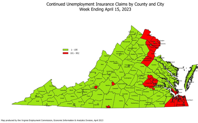 For the filing week ending April 15, the figure for seasonally unadjusted initial claims in Virginia was 1,760, which was an increase of 202 claimants from the previous week. Over half of initial claims with a self-reported industry were from administrative and support and waste management, professional, scientific, and technical services, manufacturing, health care and social assistance, and retail trade. Continued weeks claimed totaled 11,672, which was essentially unchanged from the previous week but an increase of 66% from the 7,030 continued claims from the comparable week last year.