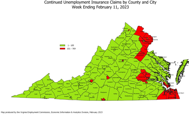 For the filing week ending February 11, the figure for seasonally unadjusted initial claims in Virginia was 1,815, which was a decrease of 14 claimants from the previous week. Over half of initial claims with a self-reported industry were from administrative and support and waste management, professional, scientific, and technical services, retail trade, construction, and health care and social assistance. Continued weeks claimed totaled 11,801, which was an increase of 102 claims from the previous week and an increase of 63% from the 7,238 continued claims from the comparable week last year.