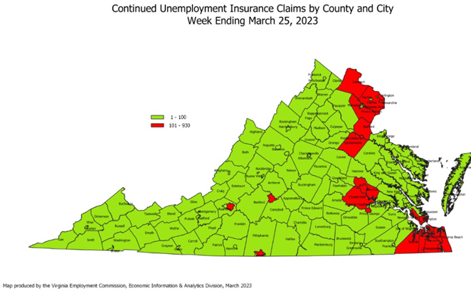 For the filing week ending March 25, the figure for seasonally unadjusted initial claims in Virginia was 1,876, which was an increase of 253 claimants from the previous week. Over half of initial claims with a self-reported industry were from administrative and support and waste management, professional, scientific, and technical services, health care and social assistance, manufacturing, and retail trade. Continued weeks claimed totaled 11,758, which was a decrease of 23 claims from the previous week but an increase of 76% from the 6,684 continued claims from the comparable week last year.