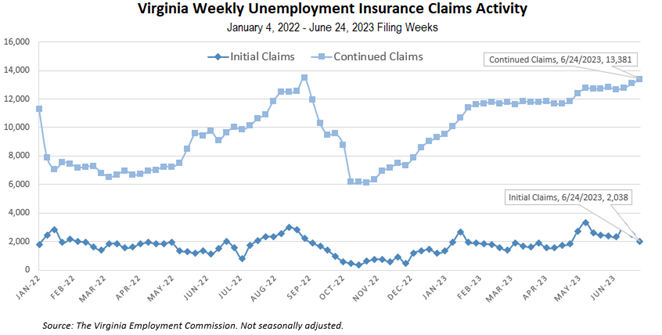 RICHMOND—The Virginia Employment Commission (VEC) announced today that the number of initial claims decreased in the latest filing week to 2,038 and remained at the typical pre-Pandemic volumes experienced in 2019.