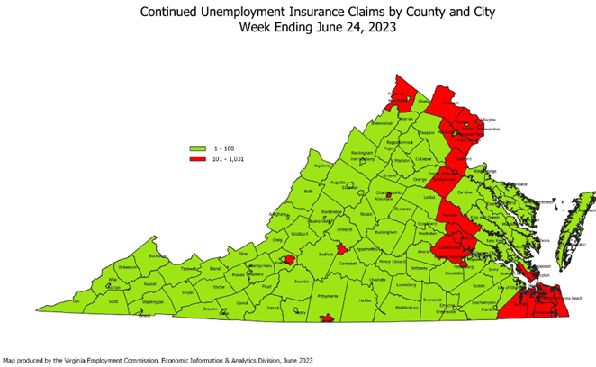 For the filing week ending June 24, the figure for seasonally unadjusted initial claims in Virginia was 2,038, which was a decrease of 448 claimants from the previous week. Continued weeks claimed totaled 13,381, which was 274 claims higher than the previous week and an increase of 33.6% from the 10,016 continued claims from the comparable week last year. Ninety-three percent of claimants self-reported an associated industry, of those reported over half (58 percent) of continued claims were from professional, scientific, and technical services (1,877), administrative and support and waste management (1,847), manufacturing (1,276), health care and social assistance (1,255), and retail trade (1,020).