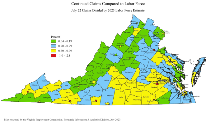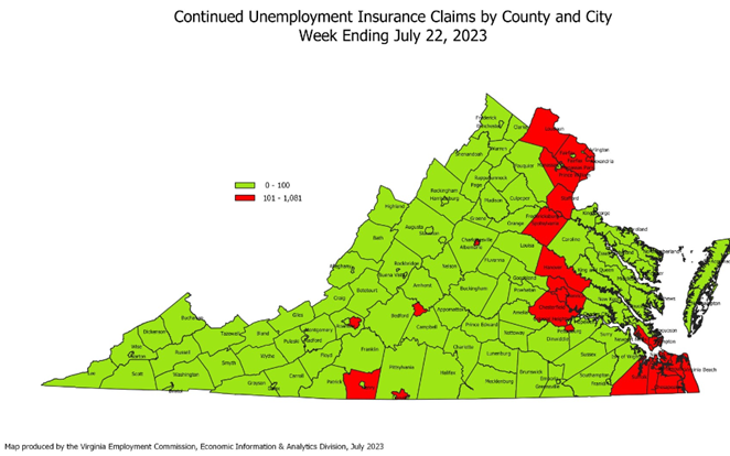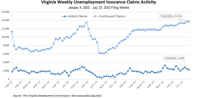 For the filing week ending July 22, the figure for seasonally unadjusted initial claims in Virginia was 2,293, which was a decrease of 131 claimants from the previous week. Continued weeks claimed totaled 13,714, which was 18 claims higher than the previous week and an increase of 25.7% from the 10,914 continued claims from the comparable week last year. Ninety-three percent of claimants self-reported an associated industry, of those reported over half (57 percent) of continued claims were from professional, scientific, and technical services (1,927), administrative and support and waste management (1,880), health care and social assistance (1,322), manufacturing (1,199), and accommodation and food services (1,015). Eligibility for benefits is determined on a weekly basis, and so not all weekly claims filed result in a benefit payment. This is because the initial claims numbers represent claim applications; claims are then reviewed for eligibility and legitimacy.