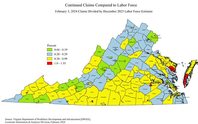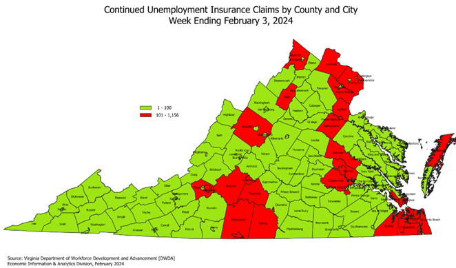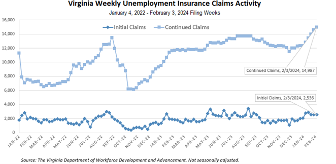 For the filing week ending February 3, seasonally unadjusted initial claims for unemployment insurance in Virginia totaled 2,536, which was a decrease of five claimants from the previous week. Continued weeks claimed totaled 14,987, which was an increase of 401 claimants from the previous week and an increase of 28 percent from the 11,699 continued claims from the comparable week last year. An industry was reported for ninety-three percent of continued claims. Of those, over half (57 percent) of continued claims were from administrative and support and waste management (2,083), professional, scientific, and technical services (1,954), construction (1,489), manufacturing (1,244), and health care and social assistance (1,235). Eligibility for benefits is determined on a weekly basis, and so not all weekly claims filed result in a benefit payment. This is because the initial claims numbers represent claim applications; claims are then reviewed for eligibility and legitimacy.