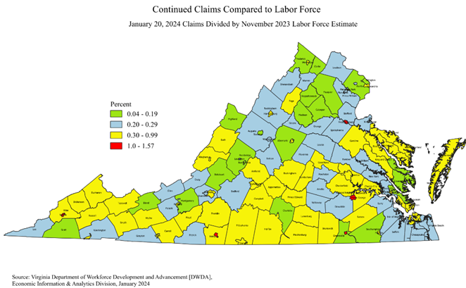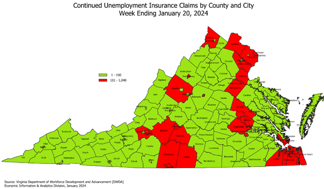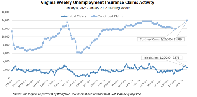 For the filing week ending January 20, seasonally unadjusted initial claims for unemployment insurance in Virginia were 2,576, which was a decrease of 307 claimants from the previous week. Continued weeks claimed totaled 13,999, which was an increase of 584 claimants from the previous week and an increase of 23 percent from the 11,371 continued claims from the comparable week last year. An industry was reported for ninety-three percent of continued claims. Of those, over half (57 percent) of continued claims were from administrative and support and waste management (1,944), professional, scientific, and technical services (1,771), construction (1,359), manufacturing (1,220), and health care and social assistance (1,184) Eligibility for benefits is determined on a weekly basis, and so not all weekly claims filed result in a benefit payment. This is because the initial claims numbers represent claim applications; claims are then reviewed for eligibility and legitimacy.