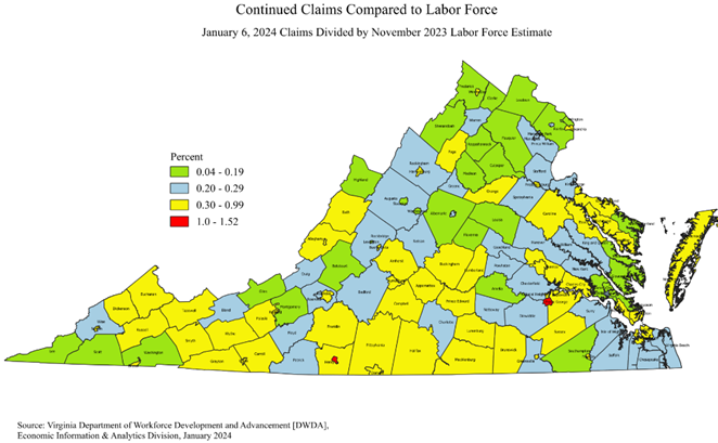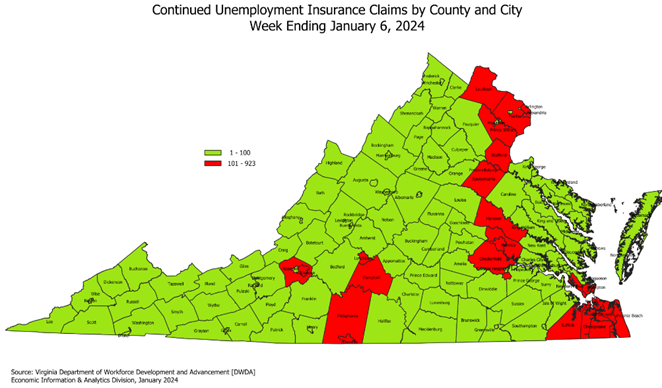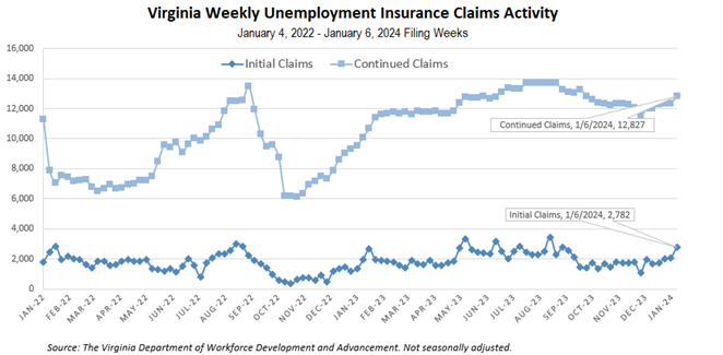 For the filing week ending January 6, seasonally unadjusted initial claims for unemployment insurance in Virginia were 2,782, which was an increase of 712 claimants from the previous week. Continued weeks claimed totaled 12,827, which was an increase from the previous week and an increase of 27 percent from the 10,089 continued claims from the comparable week last year. An industry was reported for ninety-three percent of continued claims. Of those, over half (58 percent) of continued claims were from administrative and support and waste management (1,849), professional, scientific, and technical services (1,687), manufacturing (1,213), construction (1,116), and health care and social assistance (1,077). Eligibility for benefits is determined on a weekly basis, and so not all weekly claims filed result in a benefit payment. This is because the initial claims numbers represent claim applications; claims are then reviewed for eligibility and legitimacy.