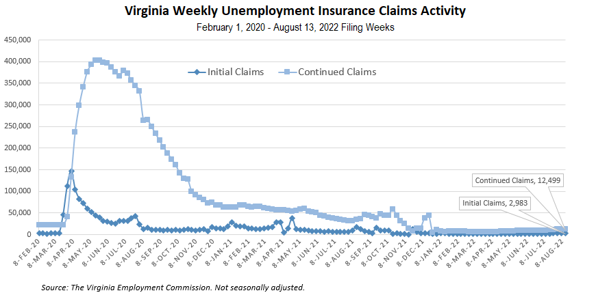 For the filing week ending August 13, the figure for seasonally unadjusted initial claims in Virginia was 2,983. The latest claims figure was an increase of 404 claimants from the previous week. Over half of initial claims that had a self-reported industry were in health care and social assistance, retail trade, administrative and support and waste management, professional, scientific and technical services, and manufacturing. Continued weeks claimed totaled 12,499, which was an increase of 23 claims from the previous week but was 64% lower than the 35,081 continued claims from the comparable week last year.