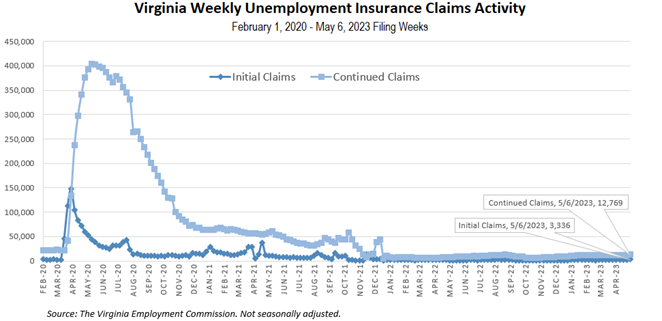 For the filing week ending May 6, the figure for seasonally unadjusted initial claims in Virginia was 3,336, which was an increase of 602 claimants from the previous week. Over half of initial claims with a self-reported industry were from manufacturing; administrative and support and waste management; professional, scientific, and technical services; and retail trade. Continued weeks claimed totaled 12,769, which was little changed from the previous week but an increase of 70% from the 7,509 continued claims from the comparable week last year.