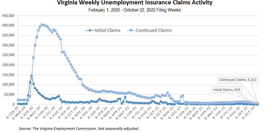 For the filing week ending October 22, the figure for seasonally unadjusted initial claims in Virginia was 614, which is an increase of 237 claimants from the previous week. Over half of initial claims with a self-reported industry were in administrative support and waste management, professional, scientific, and technical services, health care and social assistance, manufacturing, and retail trade. Continued weeks claimed totaled 6,152, which was a decrease of seven claims from the previous week and 86% lower than the 44,840 continued claims from the comparable week last year.