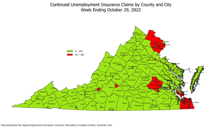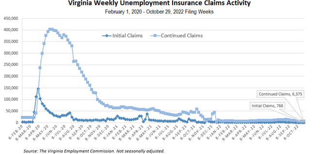 For the filing week ending October 29, the figure for seasonally unadjusted initial claims in Virginia was 766, which is an increase of 152 claimants from the previous week. Over half of initial claims with a self-reported industry were manufacturing, administrative support and waste management, professional, scientific, and technical services, health care and social assistance, and construction. Continued weeks claimed totaled 6,375, which was an increase of 223 claims from the previous week but 80% lower than the 31,564 continued claims from the comparable week last year.