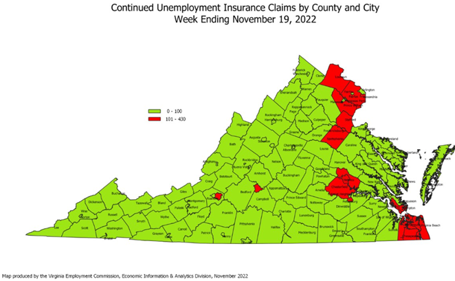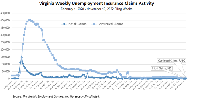 For the filing week ending November 19, the figure for seasonally unadjusted initial claims in Virginia was 925, which is an increase of 324 claimants from the previous week. Over half of initial claims with a self-reported industry were from administrative support and waste management, professional, scientific, and technical services, construction, retail trade, and manufacturing. Continued weeks claimed totaled 7,490, which was an increase of 332 claims from the previous week, but little changed from the 7,312 continued claims from the comparable week last year.