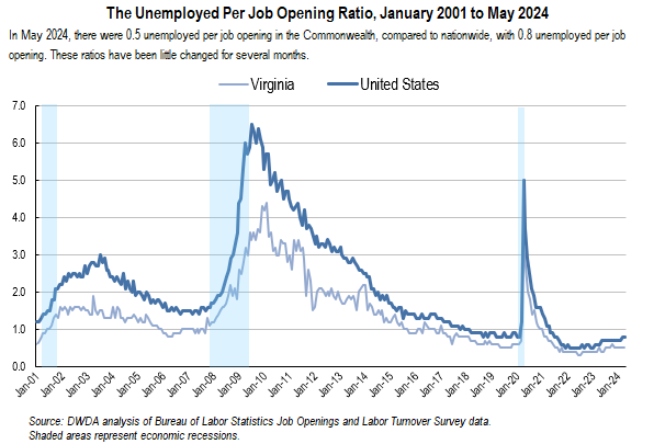 In May 2024, there were 0.5 unemployed per job opening in the Commonwealth, compared to nationwide, with 0.8 unemployed per job opening nationwide. In Virginia, the unemployed per job opening ratio (sometimes called the ‘job seekers ratio’) peaked at 4.4 unemployed per job opening in February 2010 during the Great Recession, while the number of unemployed workers per job opening stood at 3.3 in April 2020 during the height of pandemic employment impacts.
