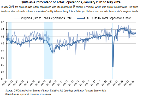 An estimated 111,000 workers quit jobs from Virginia employers in May. The number of quits increased 15,000 from April’s revised figure. That was lower by 16 percent over-the-year but 19 percent higher than five years earlier. Quits, a component of total separations, are voluntary separations initiated by the employee. In May, the number of quits nationwide was little changed at 3.5 million. Over the year, quits were down by 550,000.