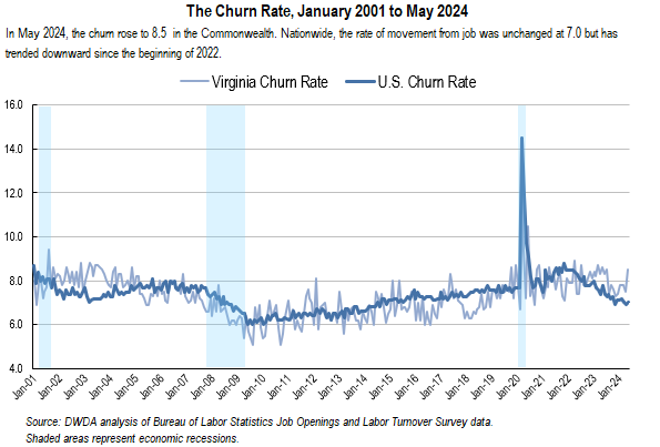 RICHMOND— Virginia Works (the Virginia Department of Workforce Development and Advancement) announced today that the U.S. Bureau of Labor Statistics’ May 2024 Job Openings and Labor Turnover Survey (JOLTS) reports the churn rate, an indicator of worker movement from job to job, increased over the month.