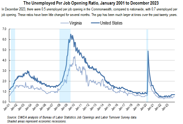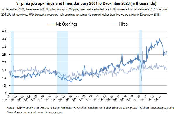 On the last business day in December, there were 275,000 job openings in Virginia, seasonally adjusted, a 21,000 increase from November 2023’s revised 254,000 job openings. Nationwide, the number of job openings changed little at nine million; this measure is down from a series high of 12.0 million in March 2022. Job openings significantly increased in professional and business services (+239,000) but decreased in wholesale trade (-83,000). The largest decreases in the job openings level occurred in Illinois (-42,000), Arizona (-21,000), and Wisconsin (-20,000). The largest increases occurred in California (+79,000), Michigan (+63,000), and Louisiana (+15,000).
