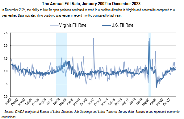 In December 2023, the Virginia ‘annual fill’ rate (the ratio of ‘this month’ hires to ’last month’ job openings, over the year) remained significantly above the historical, typical level of 1.0 at 1.14. The fill rate is a measure used to evaluate how labor markets differ in the pace that job openings are filled. An annual fill rate near or above 1.0 can indicate that employers are growing more efficient at filling job openings. On the other hand, an annual fill rate of less than 1.0 can indicate a tighter labor market, with employers having greater difficulty filling job openings compared to a year earlier. Going back to 2001, the highest annual fill rate occurred during June 2020 because, after the nationwide shutdown due to the COVID-19 pandemic, employers across the country sought to quickly hire for vacated positions. The lowest fill rate in Virginia occurred in June 2021. During that time, there were many factors that hindered the filling of vacant positions by employers, such as health concerns, employee skills, and childcare needs, but the biggest factor was the comparison against the historic re-hiring hike the year before.