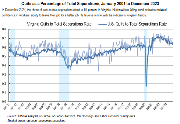 An estimated 95,000 workers quit jobs from Virginia employers in December. The number of quits decreased by 2,000 from November’s revised figure of 93,000. That was a twelve percent decrease over-the-year but a 16 percent increase from five years earlier. Quits, a component of total separations, are voluntary separations initiated by the employee. Nationwide, the number of quits changed little at 3.4 million. The number of quits decreased in health care and social assistance (-71,000) and in transportation, warehousing, and utilities (-35,000). The number of quits increased in wholesale trade (+63,000). The largest decreases in the quits level occurred in Michigan (-41,000) and Arizona (-17,000), as well as in Indiana and Oregon (-16,000 each). The quits rate in the Commonwealth edged up to 2.3 percent and remained at levels seen over the last two years. Over the month, the U.S. rate was little changed at 2.2 percent. The largest decreases in quits rates occurred in Michigan (-1.0 percentage point), South Dakota (-0.9 point), and Oregon (-0.8 point). The increase occurred in Georgia (+0.6 point).