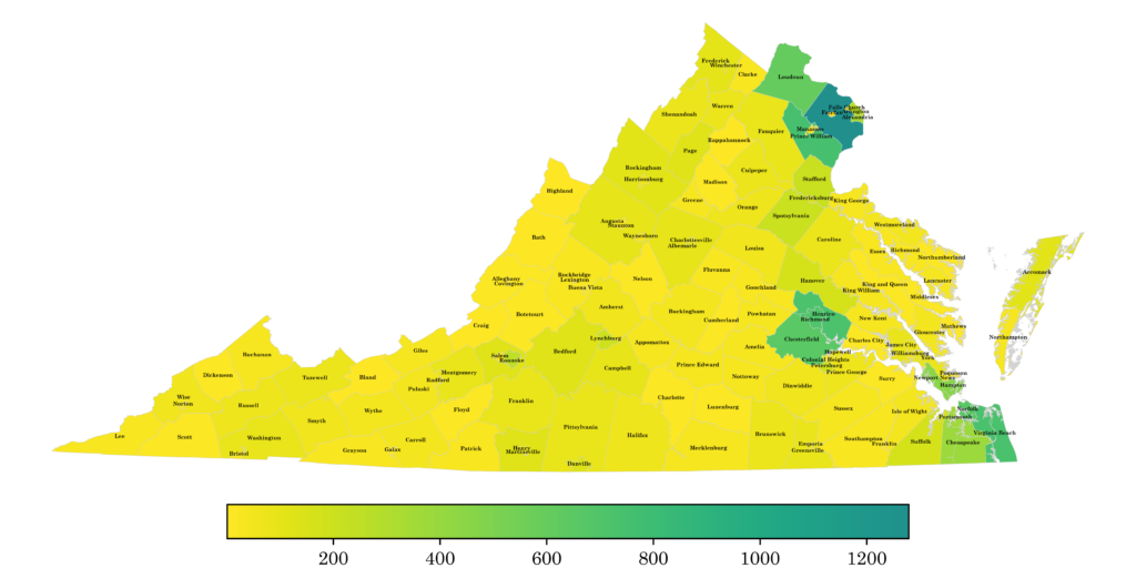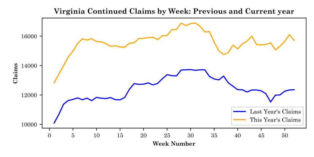 The color-coded map below shows the distribution of this week’s continued claims for Virginia’s counties and cities.