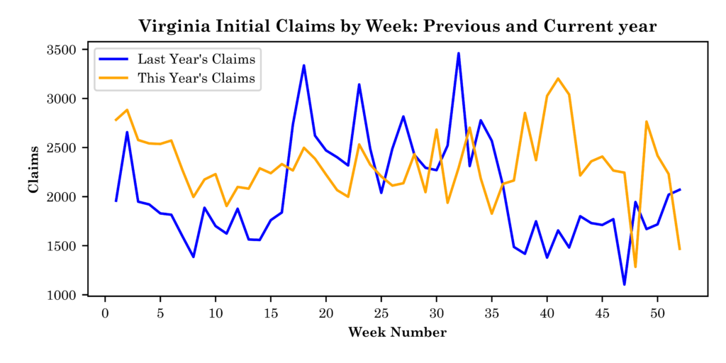 RICHMOND— Virginia Works announced today that 1,468 unemployment insurance weekly initial claims were filed during the week ending December 28, 2024, which is 34.2 percent lower than last week’s 2,230 claims and 29.1 percent lower than the comparable week of last year (2,070). Nearly 74 percent of claimants self-reported an associated industry; of those reported, the top five industries (64 percent) were Manufacturing (174); Construction (168); Accommodation and Food Services (140); Administrative and Support and Waste Management (115); and Professional, Scientific, and Technical Services (82).