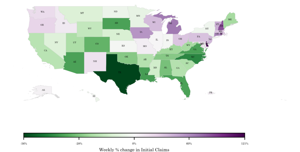 Below is a color-coded map illustrating the percentage change in initial claims from last week to this week across all states nationwide, derived from the latest U.S Department of Labor Weekly Claims News Release (https://www.dol.gov/ui/data.pdf). Green denotes a reduction in continued claims from last week, thus showing improvement, with progressively darker shades of green signifying greater improvement. Purple denotes an increase in continued claims from last week, thus showing deterioration, with progressively darker shades of purple signifying greater deterioration. Very light green, purple or white indicates minimal change from last week. The legend at the bottom provides the color spectrum along with its corresponding percentage value.
