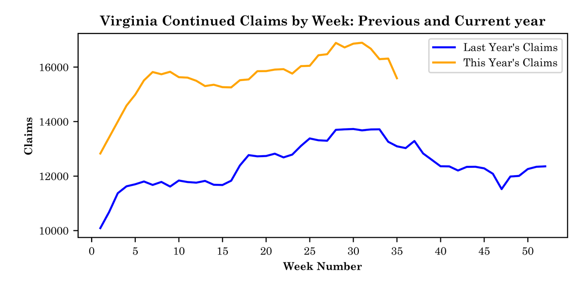 RICHMOND— Virginia Works announced today that 1,826 unemployment insurance weekly initial claims were filed during the week ending August 31, 2024, which is 16.4 percent lower than last week’s 2,185 claims and 28.9 percent lower than the comparable week of last year (2,568). Nearly 83 percent of claimants self-reported an associated industry; of those reported, the top five industries (60 percent) were Professional, Scientific, and Technical Services (232); Retail Trade (191); Administrative and Support and Waste Management (173); Health Care and Social Assistance (171); and Manufacturing (147).