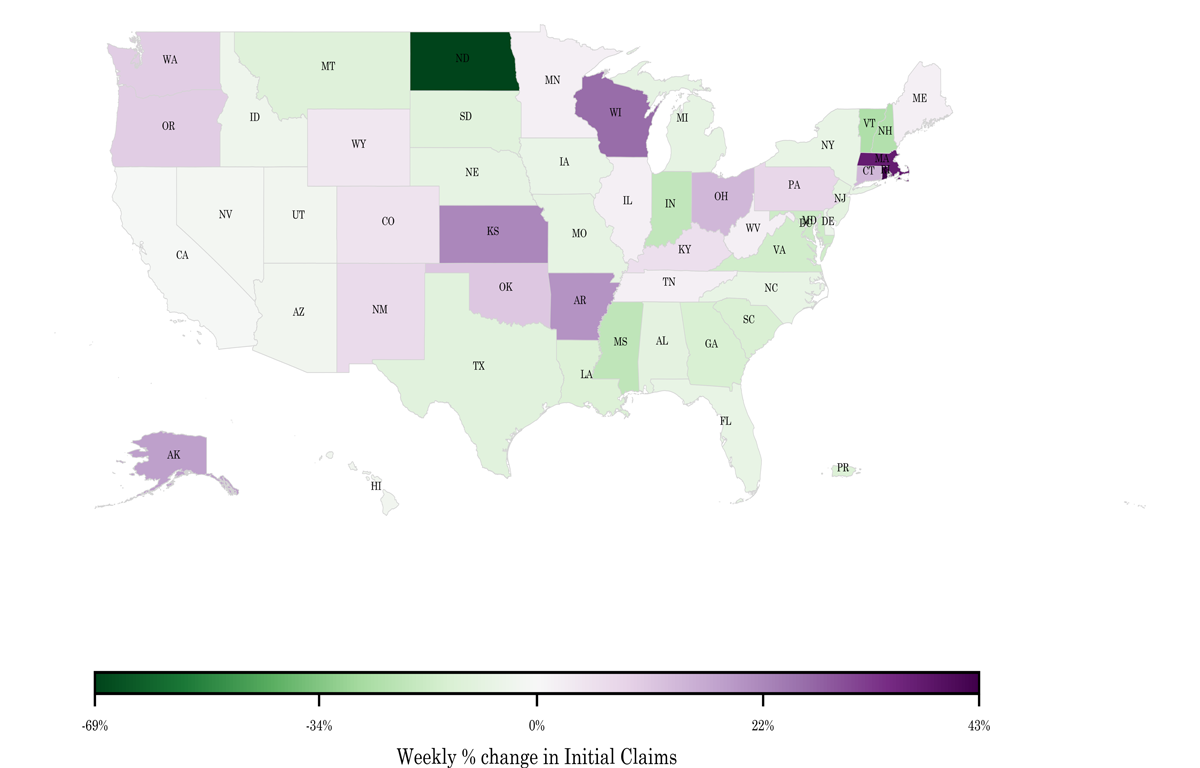 Below is a color-coded map illustrating the percentage change in initial claims from last week to this week across all states nationwide, derived from the latest U.S Department of Labor Weekly Claims News Release (https://www.dol.gov/ui/data.pdf). Green denotes a reduction in continued claims from last week, thus showing improvement, with progressively darker shades of green signifying greater improvement. Purple denotes an increase in continued claims from last week, thus showing deterioration, with progressively darker shades of purple signifying greater deterioration. Very light green, purple or white indicates minimal change from last week. The legend at the bottom provides the color spectrum along with its corresponding percentage value.