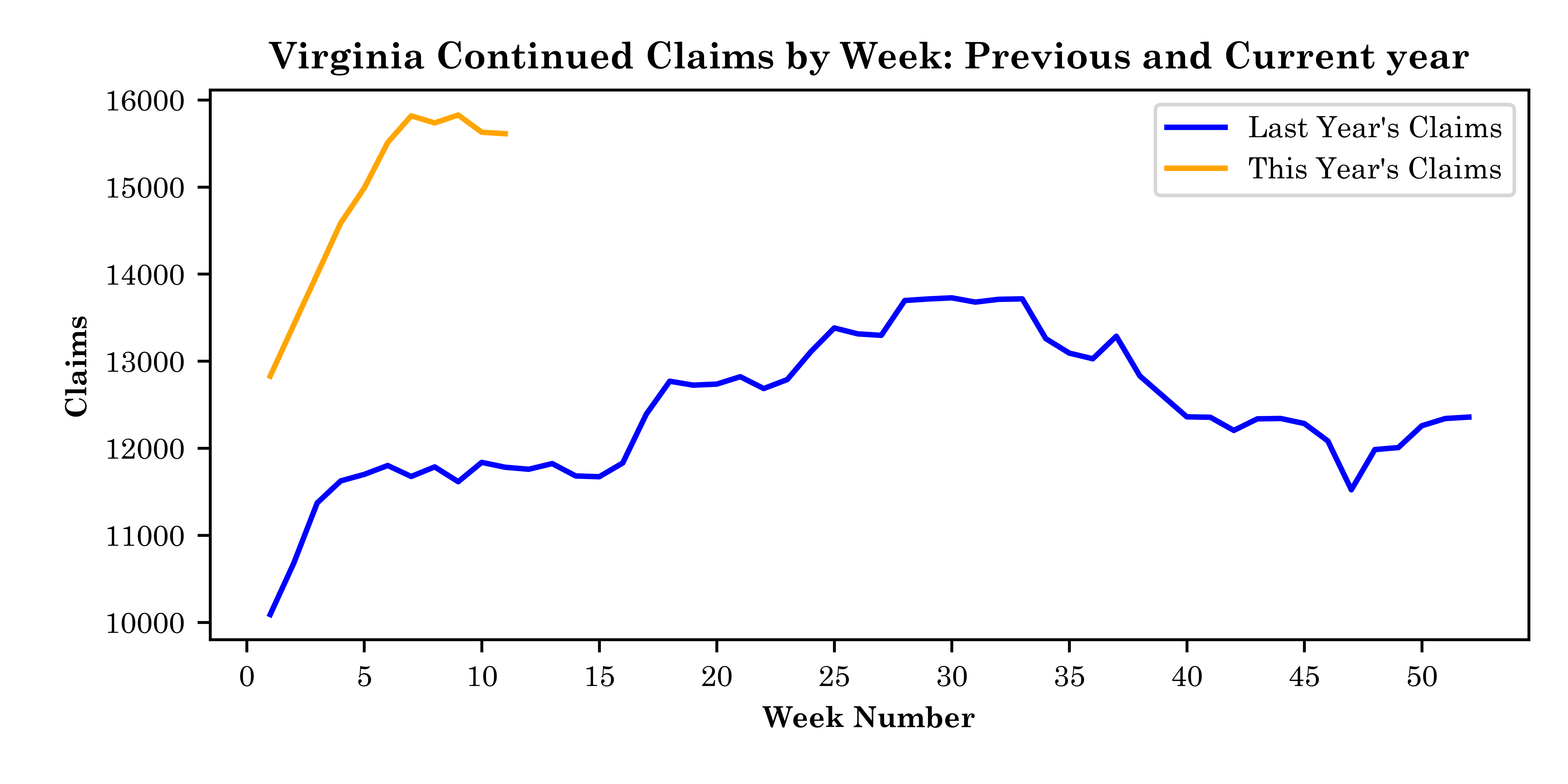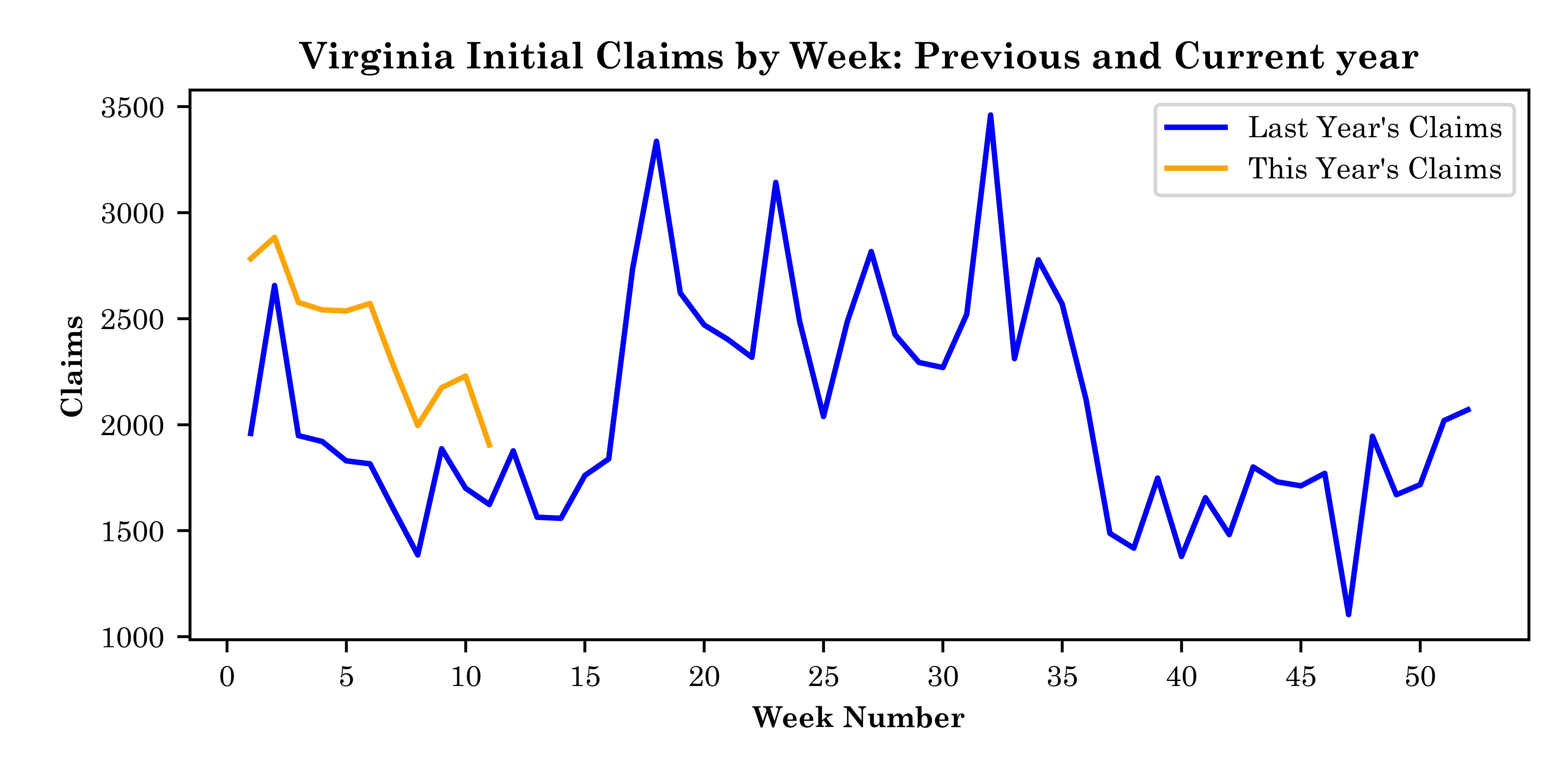 RICHMOND— Virginia Works announced today that 1,904, Unemployment Insurance Weekly Initial Claims were filed, which is 14.6 percent lower than last week’s 2,229 claims and 17.3 percent higher than the comparable week of last year (1,623). Nearly 80 percent of claimants self-reported an associated industry; of those reported, the top five industries (60 percent) were Professional, Scientific, and Technical Services (223); Manufacturing (208); Administrative and Support and Waste Management (177); Health Care and Social Assistance (157); and Accommodation and Food Services (136).