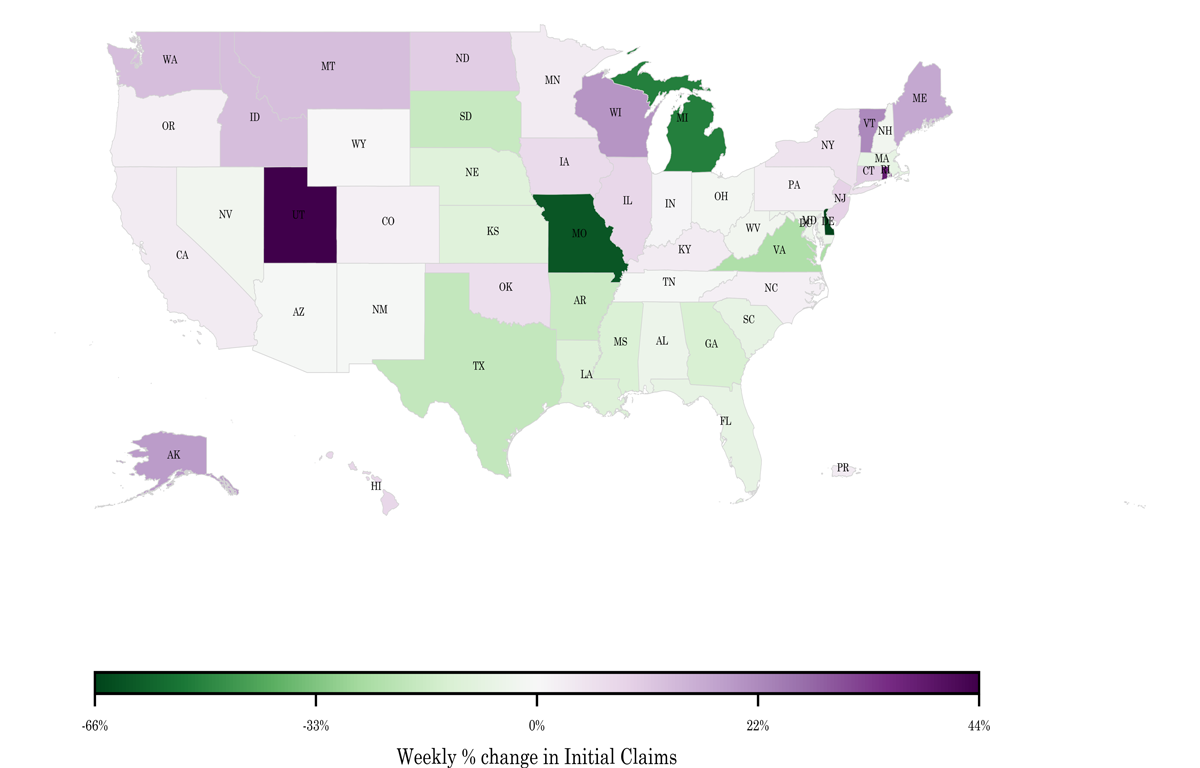 Below is a color-coded map illustrating the percentage change in initial claims from last week to this week across all states nationwide, derived from the latest U.S Department of Labor Weekly Claims News Release (https://www.dol.gov/ui/data.pdf). Green denotes a reduction in continued claims from last week, thus showing improvement, with progressively darker shades of green signifying greater improvement. Purple denotes an increase in continued claims from last week, thus showing deterioration, with progressively darker shades of purple signifying greater deterioration. Very light green, purple or white indicates minimal change from last week. The legend at the bottom provides the color spectrum along with its corresponding percentage value.