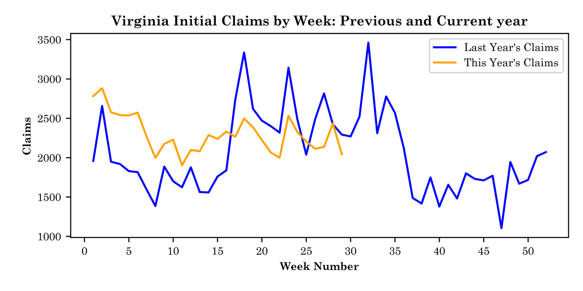 RICHMOND— Virginia Works announced today that 2,045 unemployment insurance weekly initial claims were filed during the week ending July 20, 2024, which is 15.9 percent lower than last week’s 2,433 claims and 10.8 percent lower than the comparable week of last year (2,293). Nearly 78 percent of claimants self-reported an associated industry; of those reported, the top five industries (58 percent) were Professional, Scientific, and Technical Services (201); Administrative and Support and Waste Management (197); Retail Trade (174); Health Care and Social Assistance (168); and Manufacturing (105).
