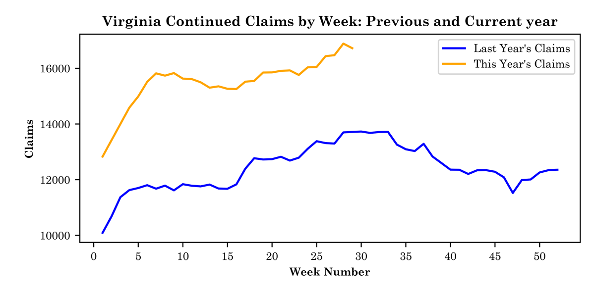 The color-coded map below shows the distribution of this week’s continued claims for Virginia’s counties and cities.