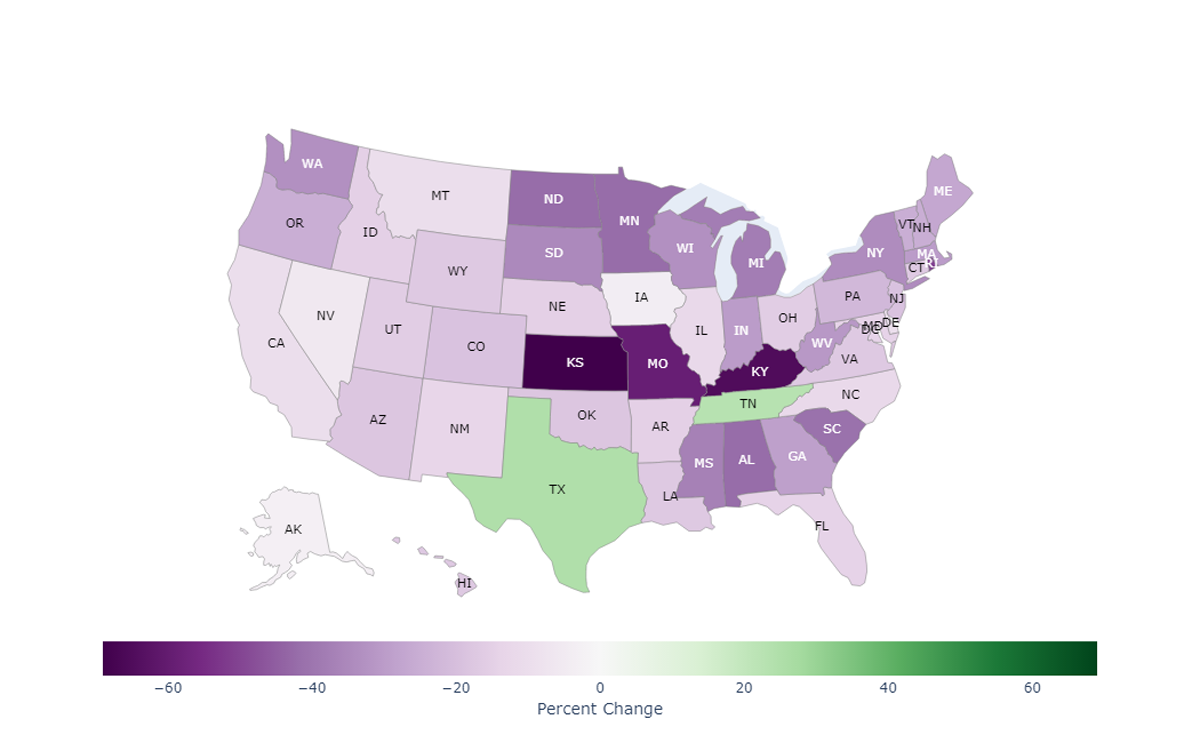 Below is a color-coded map illustrating the percentage change in initial claims from last week to this week across all states nationwide, derived from the latest U.S Department of Labor Weekly Claims News Release (https://www.dol.gov/ui/data.pdf). Green denotes a reduction in continued claims from last week, thus showing improvement, with progressively darker shades of green signifying greater improvement. Purple denotes an increase in continued claims from last week, thus showing deterioration, with progressively darker shades of purple signifying greater deterioration. Very light green, purple or white indicates minimal change from last week. The legend at the bottom provides the color spectrum along with its corresponding percentage value.