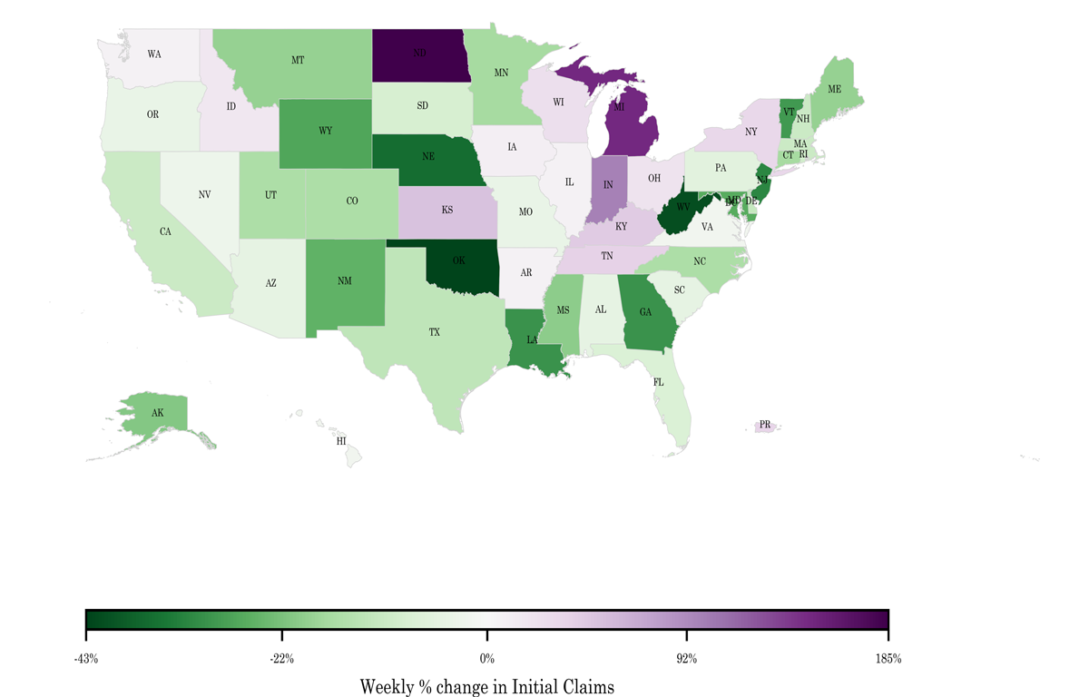 Below is a color-coded map illustrating the percentage change in initial claims from last week to this week across all states nationwide, derived from the latest U.S Department of Labor Weekly Claims News Release (https://www.dol.gov/ui/data.pdf). Green denotes a reduction in continued claims from last week, thus showing improvement, with progressively darker shades of green signifying greater improvement. Purple denotes an increase in continued claims from last week,  thus showing deterioration, with progressively darker shades of purple signifying greater deterioration. Very light green, purple or white indicates minimal change from last week. The legend at the bottom provides the color spectrum along with its corresponding percentage value.