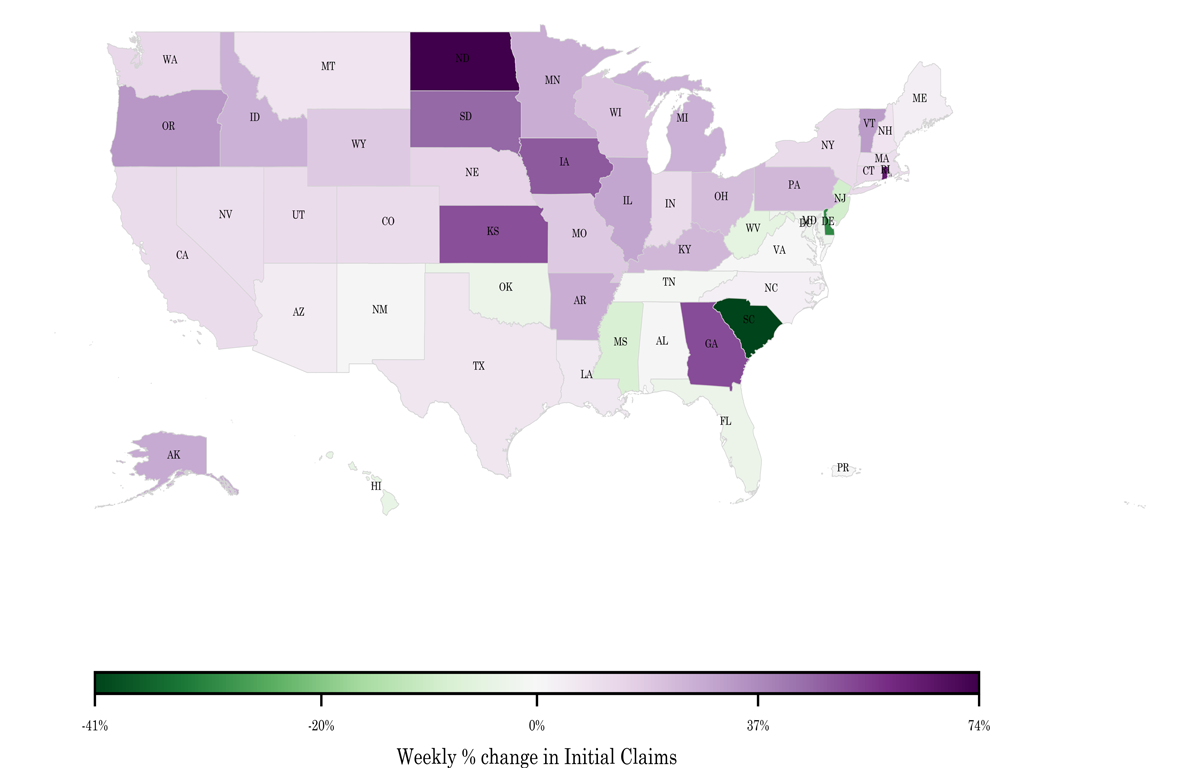 Below is a color-coded map illustrating the percentage change in initial claims from last week to this week across all states nationwide, derived from the latest U.S Department of Labor Weekly Claims News Release (https://www.dol.gov/ui/data.pdf). Green denotes a reduction in continued claims from last week, thus showing improvement, with progressively darker shades of green signifying greater improvement. Purple denotes an increase in continued claims from last week,  thus showing deterioration, with progressively darker shades of purple signifying greater deterioration. Very light green, purple or white indicates minimal change from last week. The legend at the bottom provides the color spectrum along with its corresponding percentage value.