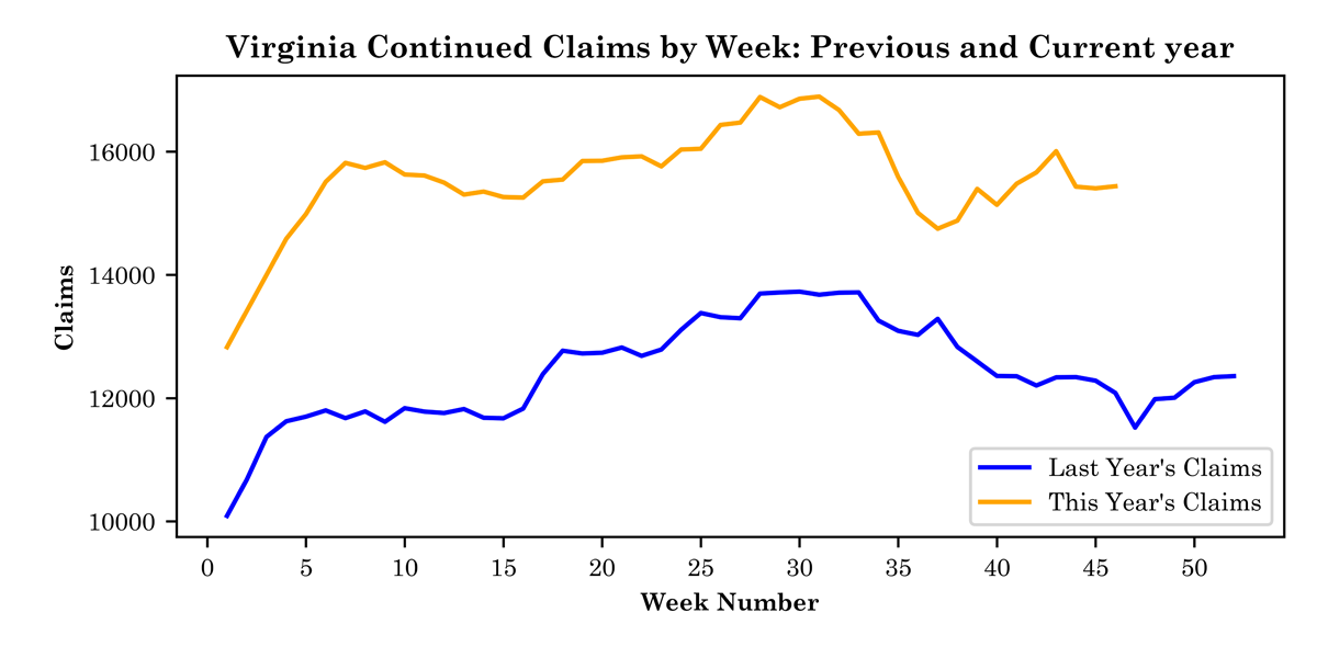 RICHMOND— Virginia Works announced today that 2,265 unemployment insurance weekly initial claims were filed during the week ending November 16, 2024, which is 5.9 percent lower than last week’s 2,408 claims and 28.0 percent higher than the comparable week of last year (1,770).  Nearly 81 percent of claimants self-reported an associated industry; of those reported, the top five industries (58 percent) were Administrative and Support and Waste Management (251); Professional, Scientific, and Technical Services (246); Retail Trade (185); Construction (177); and Manufacturing (161).