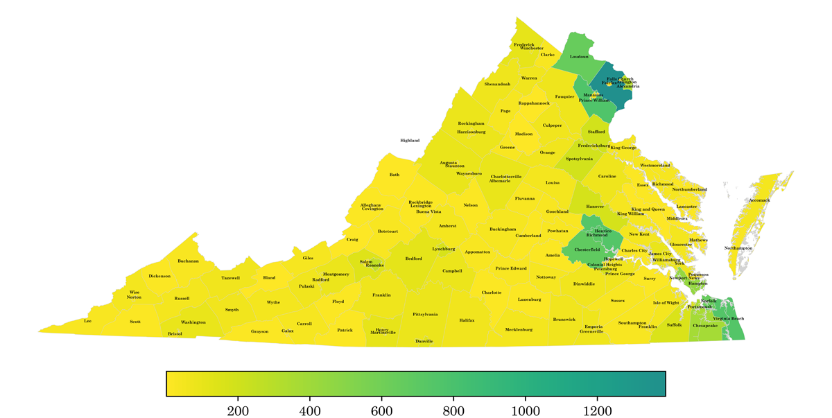 The color-coded map below shows the distribution of this week’s continued claims for Virginia’s counties and cities.