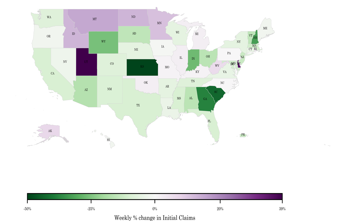 Below is a color-coded map illustrating the percentage change in initial claims from last week to this week across all states nationwide, derived from the latest U.S Department of Labor Weekly Claims News Release (https://www.dol.gov/ui/data.pdf). Green denotes a reduction in continued claims from last week, thus showing improvement, with progressively darker shades of green signifying greater improvement. Purple denotes an increase in continued claims from last week, thus showing deterioration, with progressively darker shades of purple signifying greater deterioration. Very light green, purple or white indicates minimal change from last week. The legend at the bottom provides the color spectrum along with its corresponding percentage value.