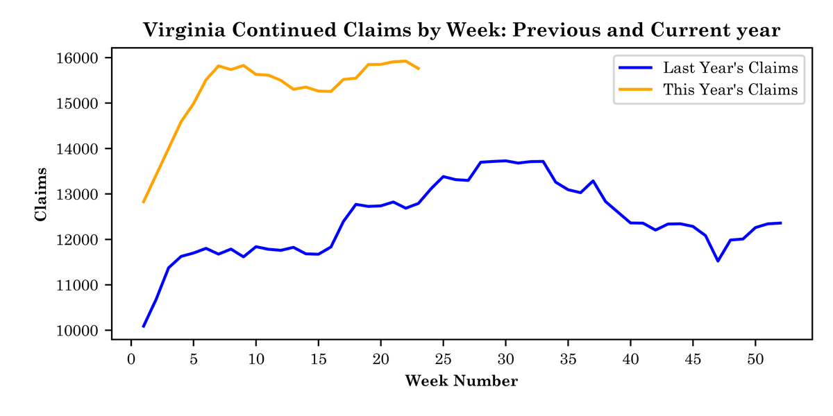 The color-coded map below shows the distribution of this week’s continued claims for Virginia’s counties and cities.