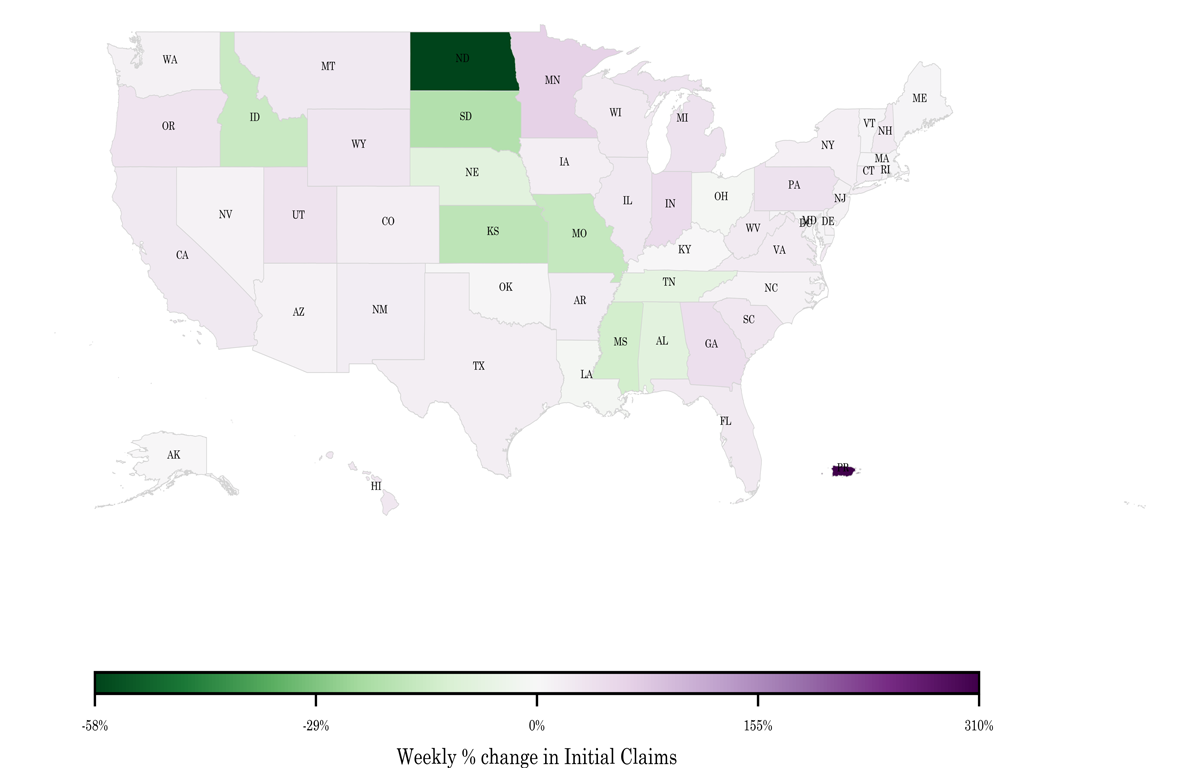 Below is a color-coded map illustrating the percentage change in initial claims from last week to this week across all states nationwide, derived from the latest U.S Department of Labor Weekly Claims News Release (https://www.dol.gov/ui/data.pdf). Green denotes a reduction in continued claims from last week, thus showing improvement, with progressively darker shades of green signifying greater improvement. Purple denotes an increase in continued claims from last week, thus showing deterioration, with progressively darker shades of purple signifying greater deterioration. Very light green, purple or white indicates minimal change from last week. The legend at the bottom provides the color spectrum along with its corresponding percentage value.