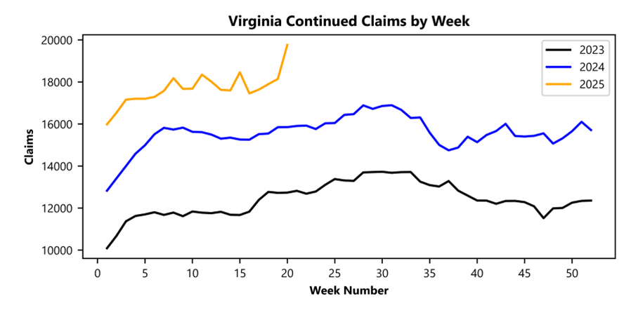 RICHMOND— Virginia Works announced today that 2,715 unemployment insurance weekly initial claims were filed during the week ending May 17, 2025, which is 32.0 percent lower than last week’s 3,992 claims and 22.1 percent higher than the comparable week of last year (2,224). Nearly 80 percent of claimants self-reported an associated industry; of those reported, the top five industries (64 percent) were Professional, Scientific, and Technical Services (387); Accommodation and Food Services (342); Administrative and Support and Waste Management (237); Health Care and Social Assistance (194); and Retail Trade (188).