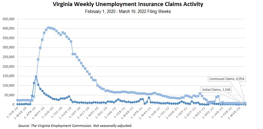 For the filing week ending March 19, the figure for seasonally unadjusted initial claims in Virginia was 1,546. The latest claims figure was a decrease of 308 claimants from the previous week. Over half of initial claims that had a self-reported industry were in administrative and waste services, retail trade, health care and social assistance, and manufacturing. Eligibility for benefits is determined on a weekly basis, and so not all weekly claims filed result in a benefit payment. This is because the initial claims numbers represent claim applications; claims are then reviewed for eligibility and legitimacy.