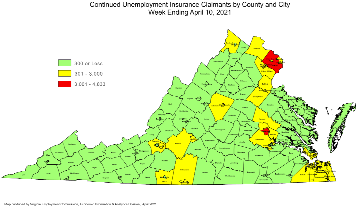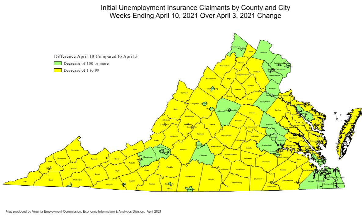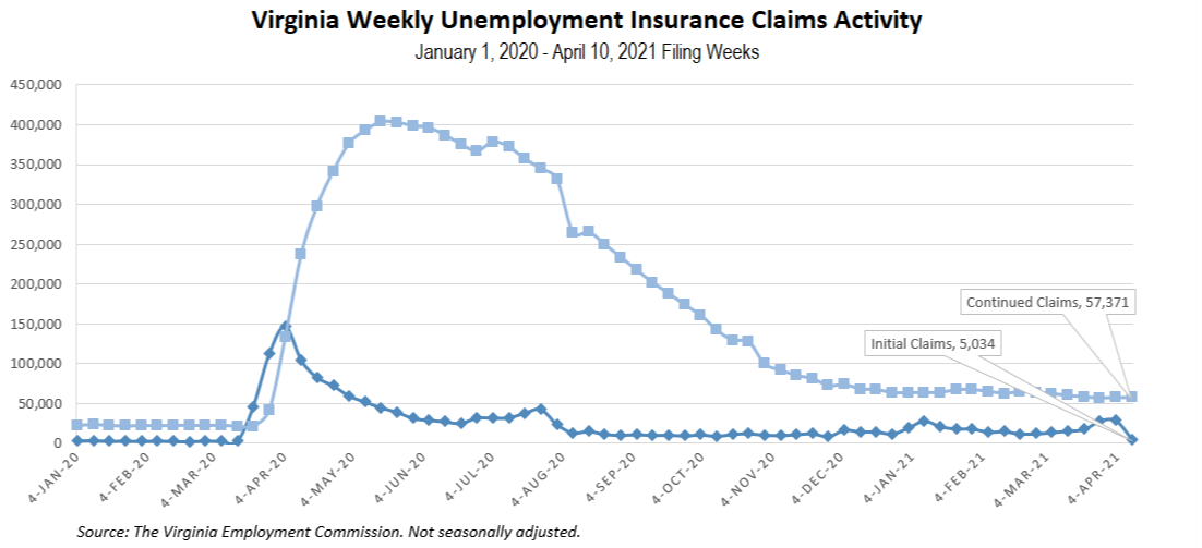 RICHMOND—The Virginia Employment Commission (VEC) announced that the number of initial claims filed during the most recent filing week were 95% lower than in the comparable week in 2020 when pandemic employment impacts were near their peak.