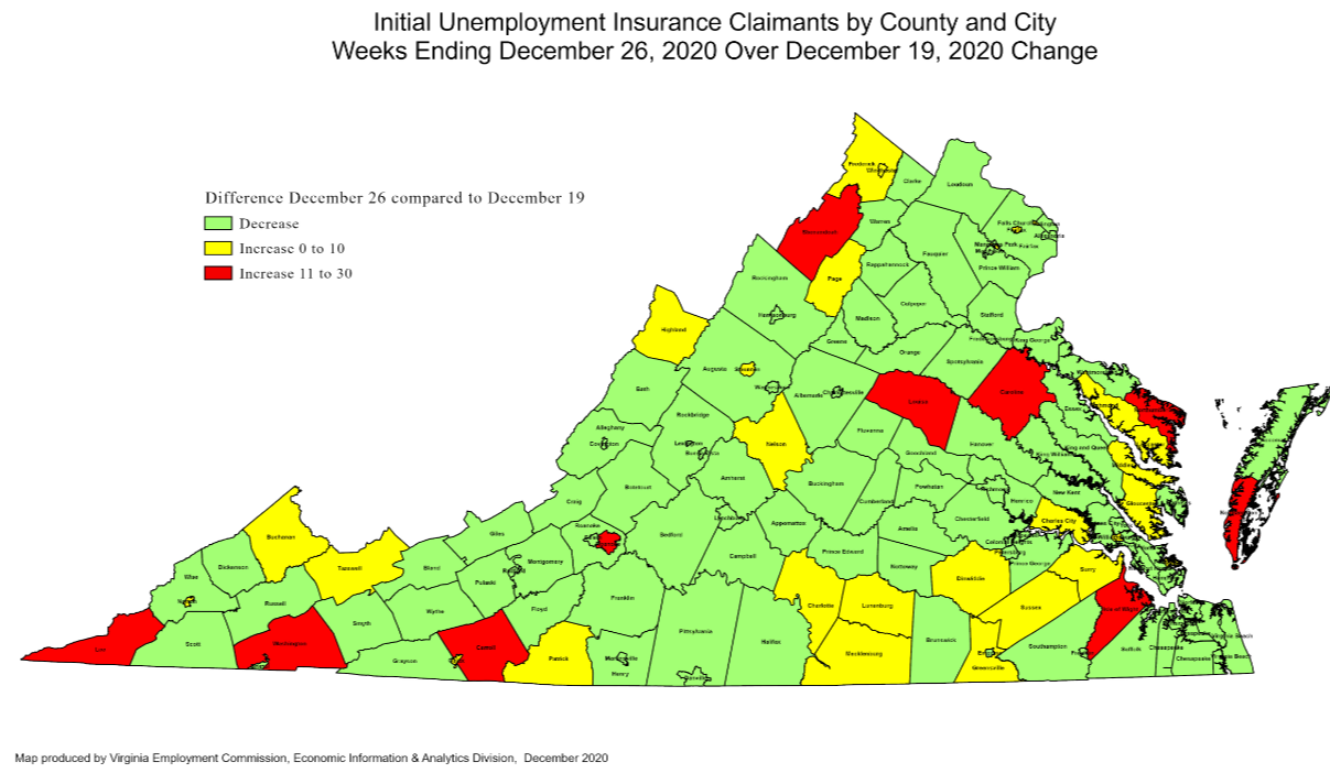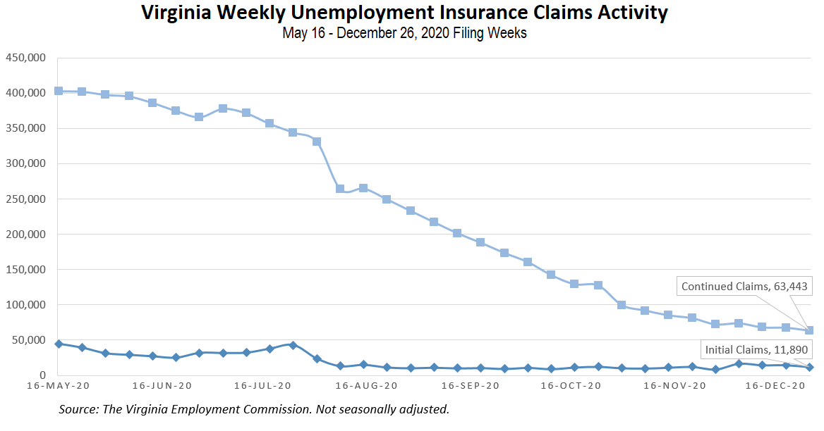 RICHMOND—The Virginia Employment Commission (VEC) announced that the number of continued claims filed during the December 26 filing week dipped below 65,000 to its lowest level since early May, according to figures released today.