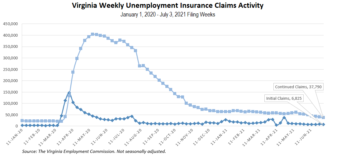 For the filing week ending July 3, the figure for seasonally unadjusted initial claims in Virginia was 6,825. The latest claims figure was a decrease of 1,371 claimants from the previous week. This brought the total number of claims filed since the March 21, 2020 filing week to 1,727,897, compared to the 477,600 average filed during the previous three economic recessions since 1990.
