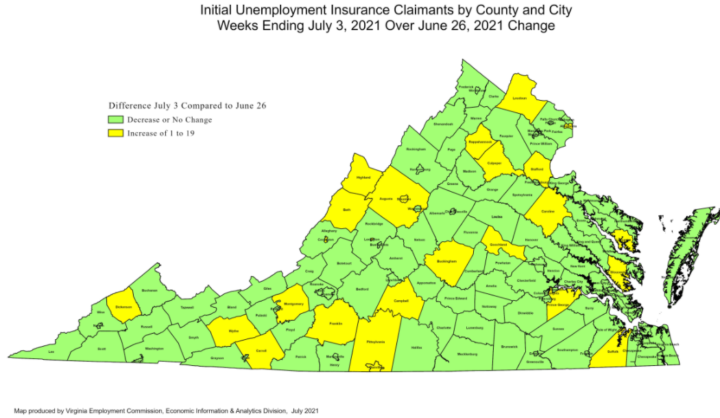 Nationwide, in the week ending July 3, the advance figure for seasonally adjusted initial claims was 373,000, an increase of 2,000 from the previous week’s revised level. The previous week’s level was revised up by 7,000 from 364,000 to 371,000. The advance number of actual initial claims under state programs, unadjusted, totaled 369,661 in the week ending July 3, an increase of 3,147 (or 0.9 percent) from the previous week. There were 1,391,178 initial claims in the comparable week in 2020. Looking at preliminary data, slightly more states reported decreases on a seasonally unadjusted basis. Puerto Rico’s preliminary weekly change (-4,319) was the largest decrease. Oklahoma’s preliminary weekly change (-3,688) was the second largest decrease. Maryland’s preliminary weekly change (-2,847) was the third largest decrease. Washington’s decline was the fourth largest decrease (-1,978). Virginia’s decrease (-29) was the 25th largest decrease.