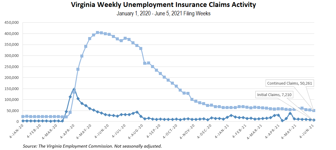 Nationwide, in the week ending June 5, the advance figure for seasonally adjusted initial claims was 376,000, a decrease of 9,000 from the previous week’s unrevised level of 385,000. This is the lowest level for initial claims since March 14, 2020 when it was 256,000. The advance number of actual initial claims under state programs, unadjusted, totaled 367,117 in the week ending June 5, a decrease of 58,196 (or -13.7 percent) from the previous week. There were 1,556,548 initial claims in the comparable week in 2020. Looking at preliminary data, most states reported decreases on a seasonally unadjusted basis. Pennsylvania’s preliminary weekly change (-23,703) was the largest decrease. California’s preliminary weekly change (-18,999) was the second largest decrease. Texas’s preliminary weekly change (-4,193) was the third largest decrease. Missouri’s decline was the fourth largest decrease (-3,150). Virginia’s decrease (-187) was the 33rd largest decrease.