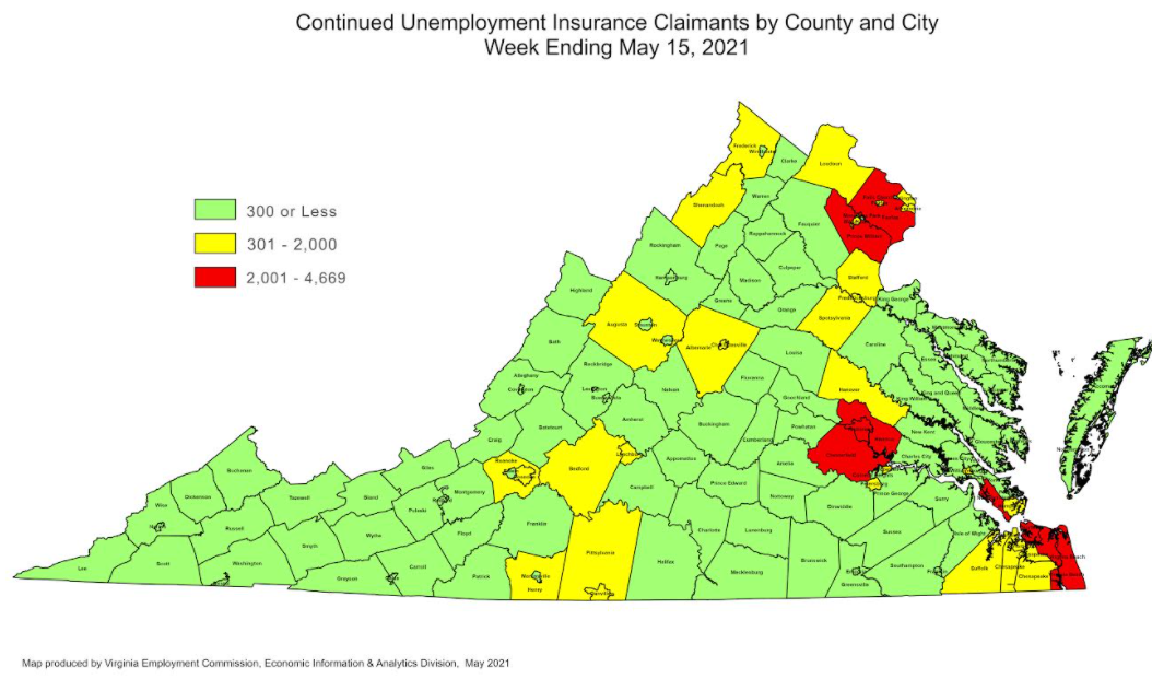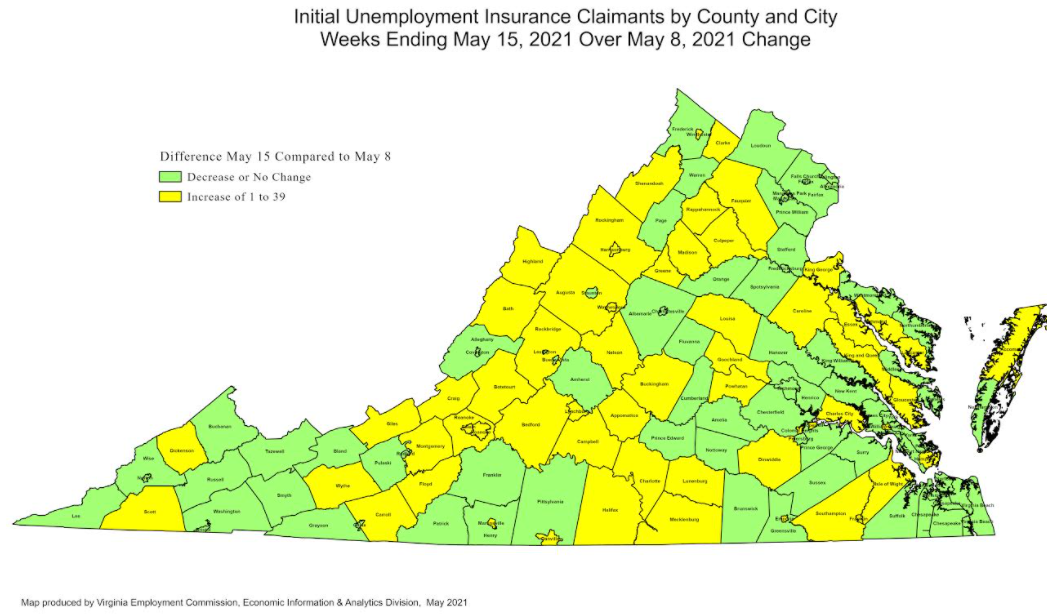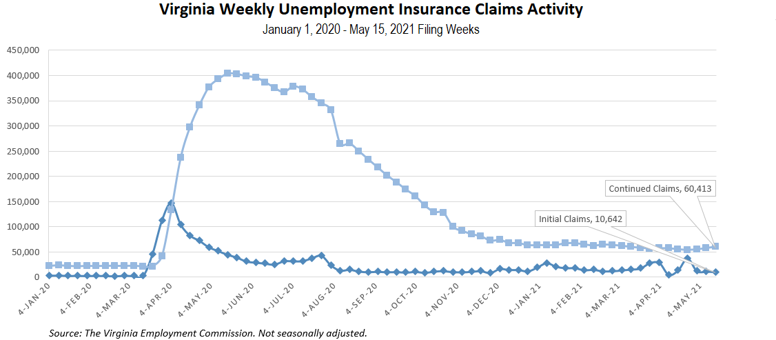 RICHMOND—The Virginia Employment Commission (VEC) announced that the number of initial claims filed during the most recent filing week continued the trend of recent weeks’ lower claims volumes.