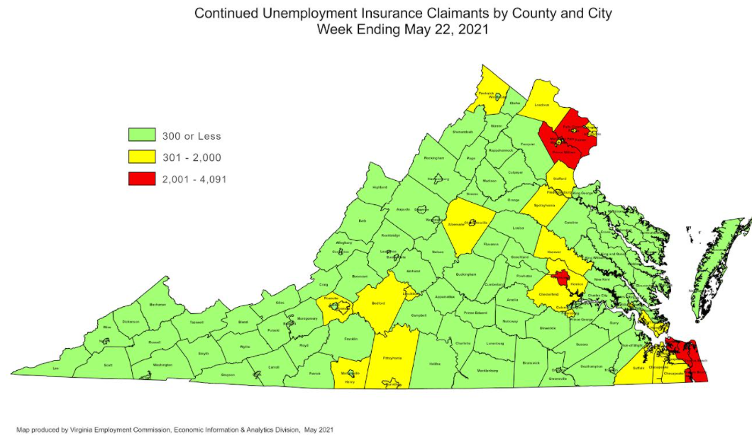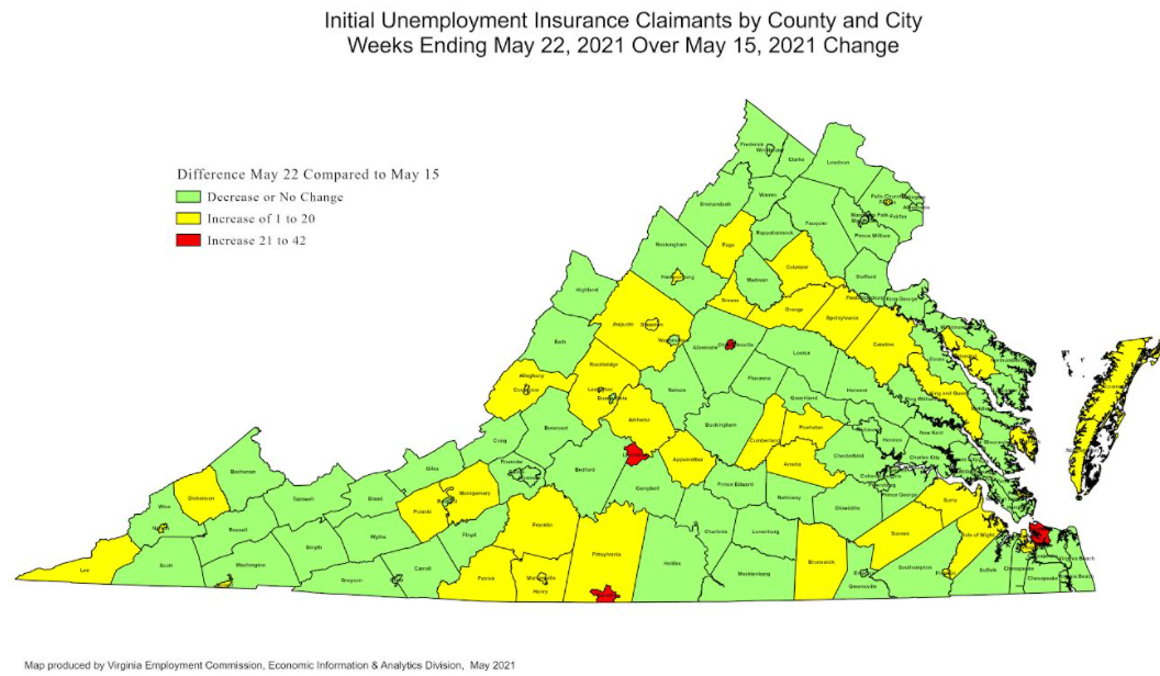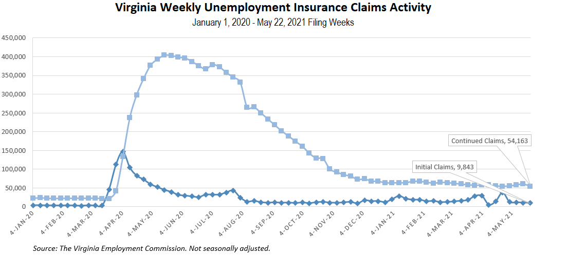 RICHMOND—The Virginia Employment Commission (VEC) announced that the number of initial claims filed during the most recent filing week continued the trend of recent weeks’ lower claims volumes.
