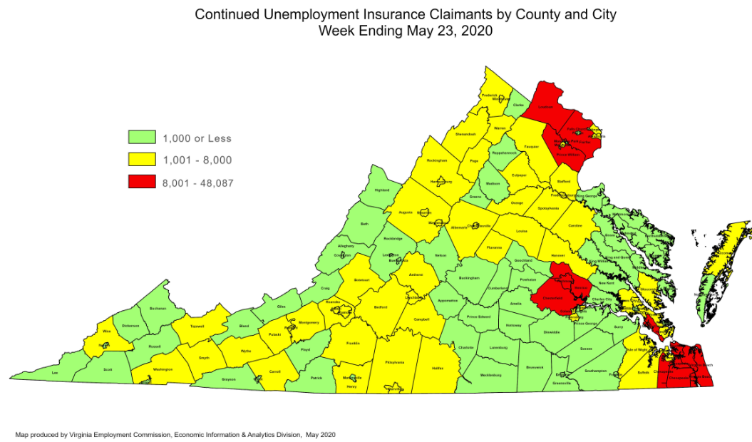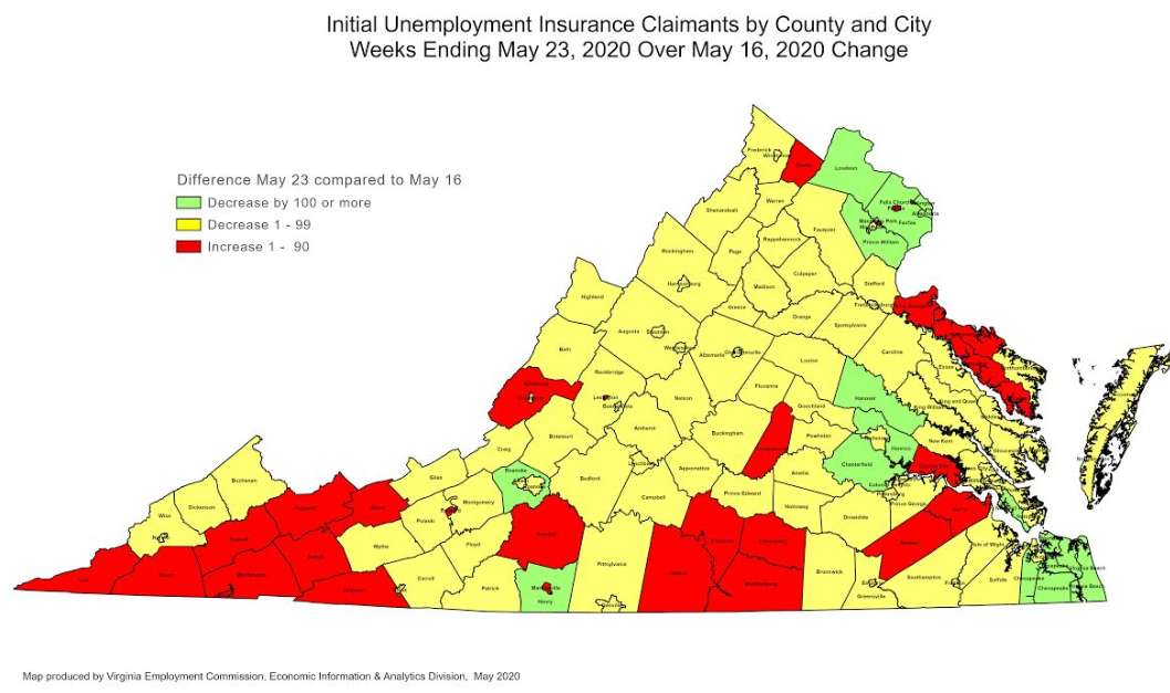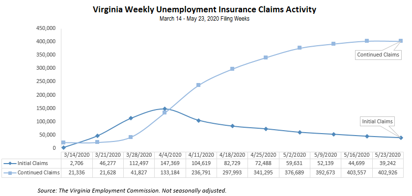 RICHMOND—The Virginia Employment Commission (VEC) announced that the total number of initial claims filed in the ten weeks from mid-March through the May 23, 2020 filing week were over 100,000 more than were filed during the Great Recession that lasted from December 2007 to June 2009.