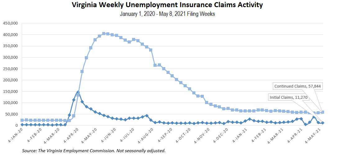 For the filing week ending May 8, the figure for seasonally unadjusted initial claims in Virginia was 11,270. The latest claims figure was a decrease of 961 claimants from the previous week. This brought the total number of claims filed since the March 21, 2020 filing week to 1,662,337, compared to the 477,600 average filed during the previous three economic recessions since 1990.