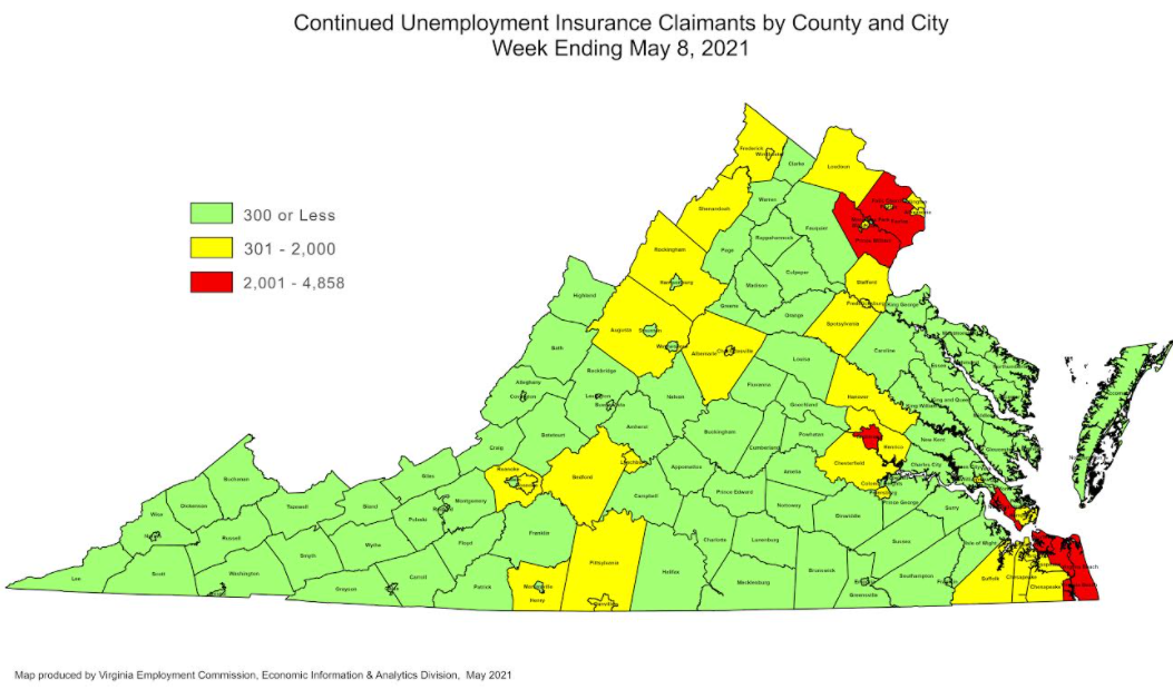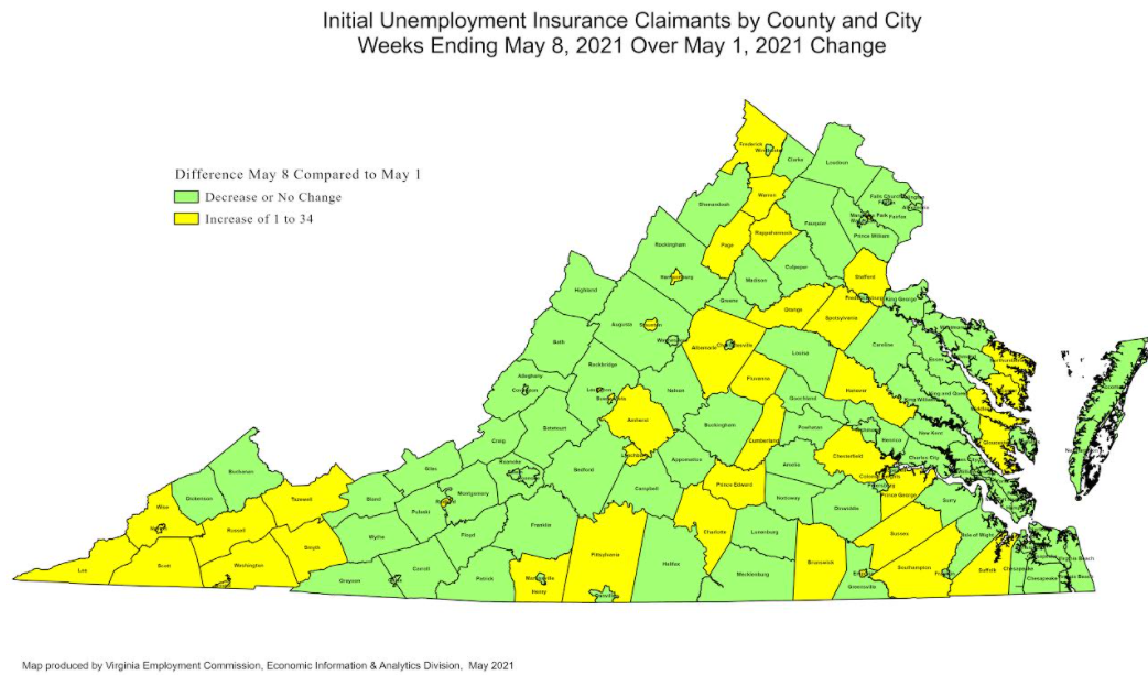 Nationwide, in the week ending May 8, the advance figure for seasonally adjusted initial claims was s 473,000, a decrease of 34,000 from the previous week’s revised level. The previous week’s level was revised up by 9,000 from 498,000 to 507,000. The advance number of actual initial claims under state programs, unadjusted, totaled 487,436 in the week ending May 8, a decrease of 26,286 (or -5.1 percent) from the previous week. There were 2,326,632 initial claims in the comparable week in 2020. Looking at preliminary data, most states reported decreases on a seasonally unadjusted basis. Michigan’s preliminary weekly change (-14,589) was the largest decrease. New York’s preliminary weekly change (-8,441) was the second largest decrease. Vermont’s preliminary weekly change (-5,860) was the third largest decrease. Florida’s decline was the fourth largest decrease (-4,893). Virginia’s negligible rise (+180) was the 17th largest increase.