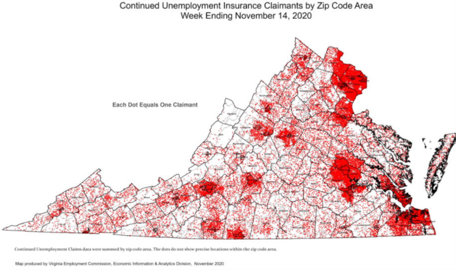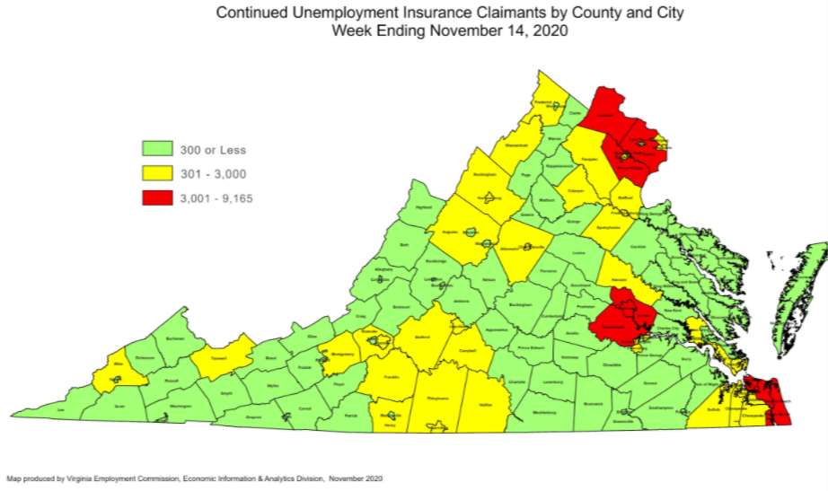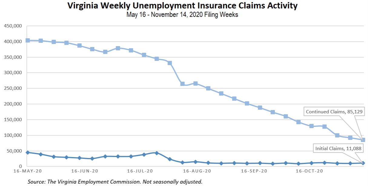 RICHMOND—The Virginia Employment Commission (VEC) announced that the number of continued claims filed during the November 7 filing week remained below 100,000 continuing recent trends, according to figures released today.